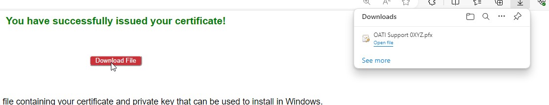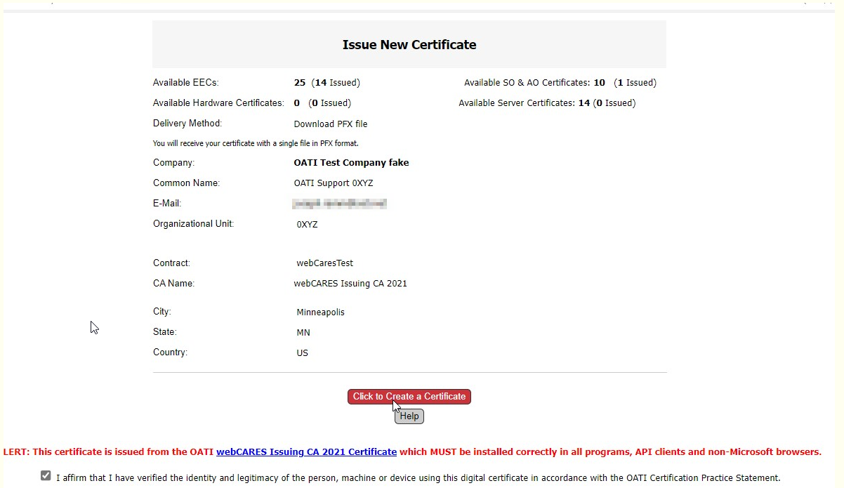 Click on the “I affirm…” button and then ‘Click to Create a Certificate’.